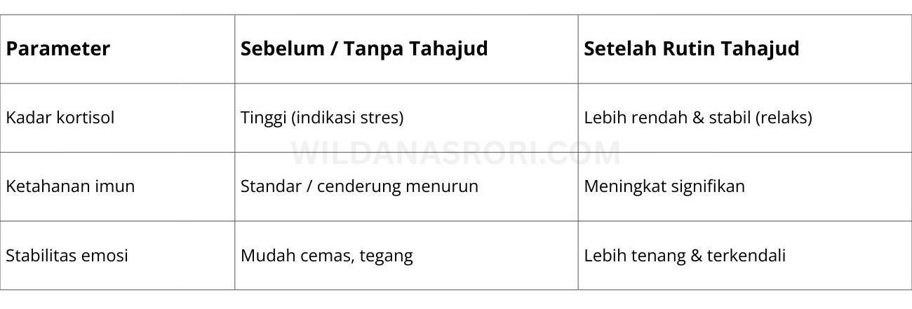 Dalam penelitiannya, disebutkan bahwa orang yang rutin melaksanakan Tahajud menunjukkan perubahan yang cukup signifikan pada beberapa parameter biologis. Salah satunya adalah kadar kortisol—hormon yang sangat berkaitan dengan stres. Berikut gambaran sederhananya: