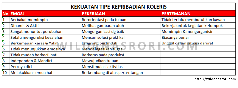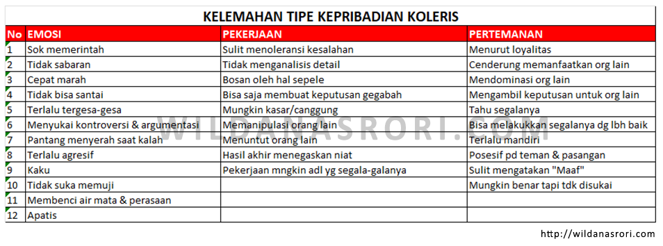 Untuk mempermudah Anda dalam mengenal Tipe Kepribadian Koleris ini, saya sajikan berupa table.